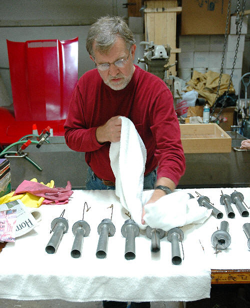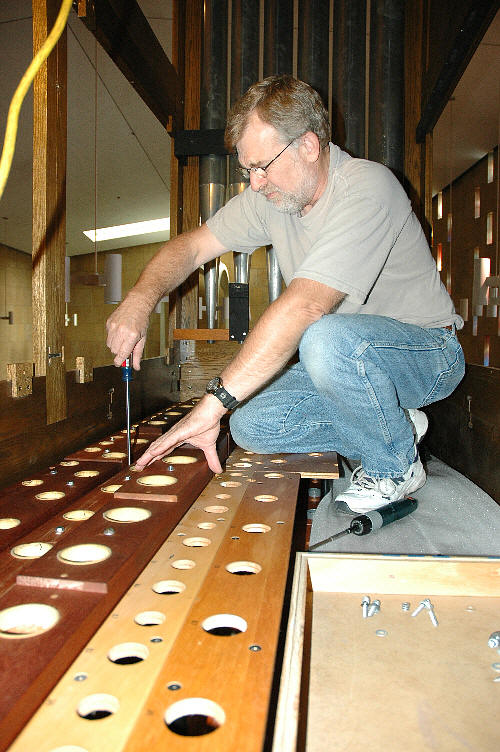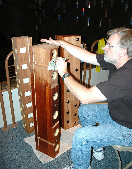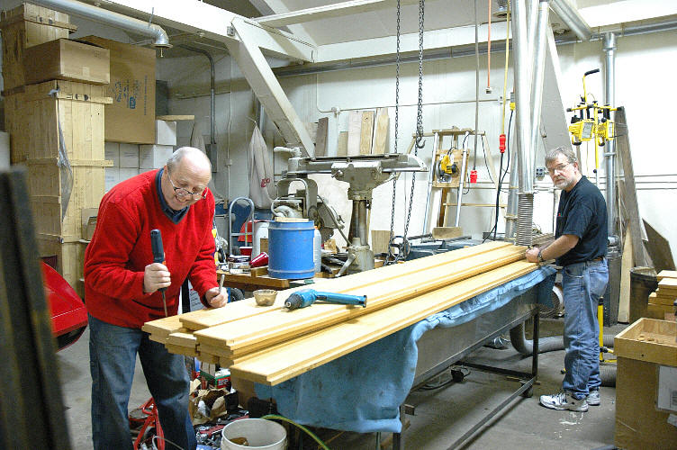 Tom Deyo and Mike prepare the organ floor for refinishing. |